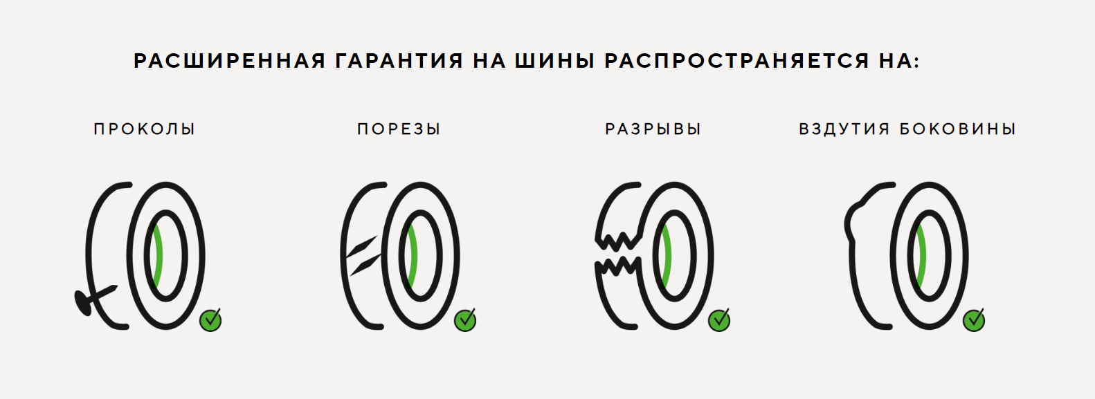 - Расширенная гарантия распространяется на шины, поврежденные в результате дорожно-транспортного происшествия.